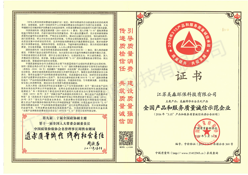 2016年全國產品和服務質量誠信示范企業-凈水全系列產品